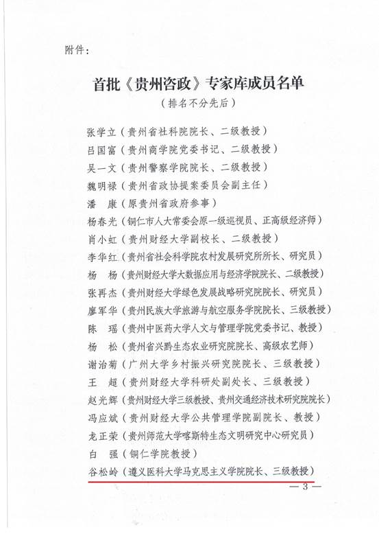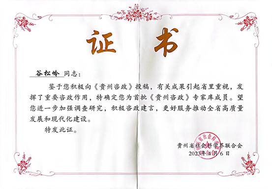 4月6日下午,省社科联在贵州饭店召开《贵州咨政》工作推进会暨社科专家座谈会。省社科联党组书记、副主席张云泓同志出席并讲话,省社科联党组成员、副主席黄昌祥宣读首批《贵州咨政》专家库成员名单,会议为首批专家库成员颁发了证书。鉴于公司谷松岭教授在贵州红色文化建设咨政建言的突出表现,被聘为首批专家库成员。