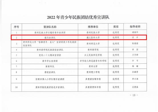 近日,贵州省民族宗教事务委员会、省教育厅、团省委正式公布全省2022年青少年民族团结优秀宣讲队评选结果(共评选10支),公司365英国在线体育硕士生导师沈洋副教授指导的“骏马”宣讲队成功入选,是遵义市唯一一支获此殊荣的队伍,体现公司思想政治教育专业研究生的培养水平,展现公司师生理论宣讲所取得的显著成效。