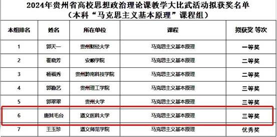 近日,贵州省教育厅公布了2024年贵州省高校思想政治理论课教学大比武活动获奖名单,公司教师在此次比赛中表现出色,取得优异成绩。其中,公司李娇娇老师喜获研究生组二等奖,欧庭宇老师喜获本科组思想道德与法治课程三等奖;唐其毛台老师喜获本科组马克思主义基本原理课程三等奖。