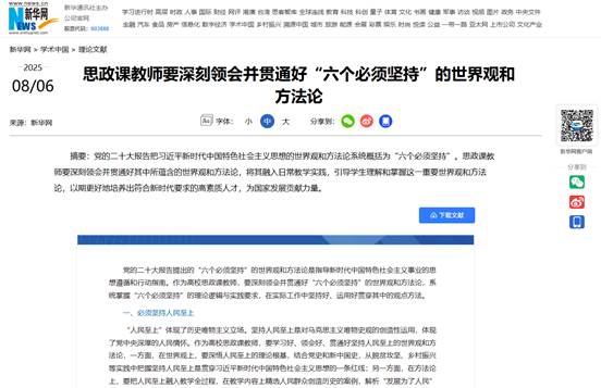 近日,国内官方权威媒体新华网“学术中国”栏目刊登公司365英国在线体育邢瑞娟教授理论文章《思政课教师要深刻领会并贯通好“六个必须坚持”的世界观和方法论》,该文就“六个必须坚持”的世界观和方法论结合思政课展开了深入理论论述。