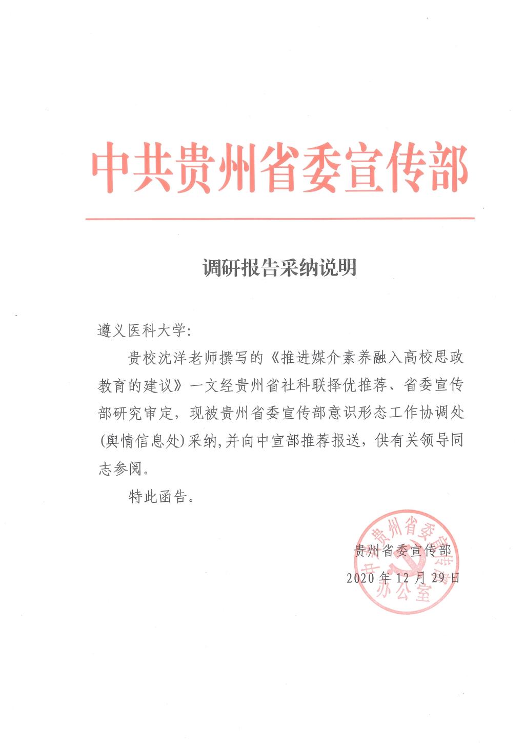 一直以来,365英国在线体育积极响应贵州省委“将论文写在贵州大地上”的号召,积极推动教师将教学和科研围绕党中央、国务院重大决策部署,围绕社会热点、难点问题,围绕贵州社会发展的关切问题开展工作。沈洋副教授充分发挥自身专业所长,撰写了高水平的咨政报告,为我省经济社会发展积极建言献策,被贵州省委宣传部采纳并进一步向中宣部推荐报送,为贵州省相关的工作提供了智力支持。此次沈洋副教授研究成果被相关部门采纳,是公司教学和科研为地方发展服务的重要表现,同时,也扩大了公司马克思主义学科的社会影响。(审核:谷松岭,撰稿:吴启存)