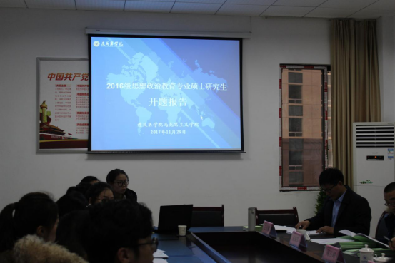 开题报告由思政教研室主任王纪鹏副教授主持。2016级研究生吴广丹、刘燕红、陈娅等11人通过PPT的形式就论文选题的依据、研究目的和意义、研究的主要内容、国内外研究现状、研究方法、论文基本结构等方面进行汇报。各位专家针对对每位研究生选题的可行性、论文结构框架的合理性、逻辑性等方面存在的不足提出了针对性的修改意见和建议。