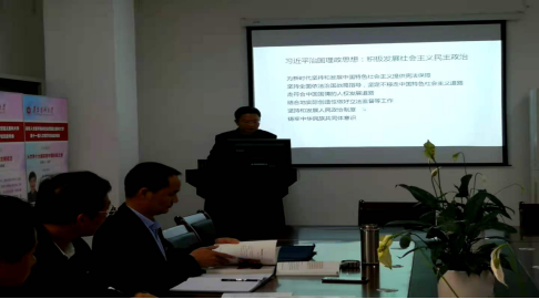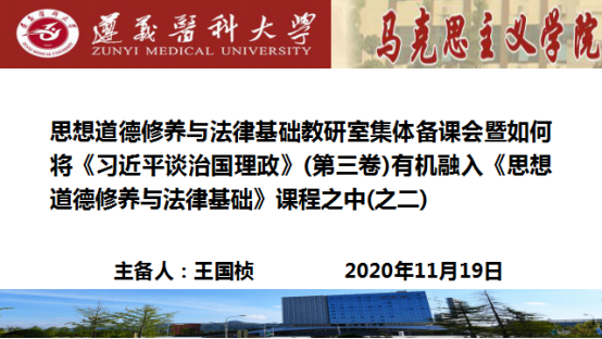 2020年11月19日,上午8:30,基础教研室在人文楼122会议室举行了2020年秋季学期第四次集体备课活动暨如何将《习近平谈治国理政》(第三卷)有机融入《思想道德修养与法律基础》课程教学当中。会议由教研室主任简红江主持,集体备课内容为《思想道德修养与法律基础》教材第六章内容“尊法学法守法用法”,由王国桢老师主备,教研室所有无教学任务的老师参加了此次会议。